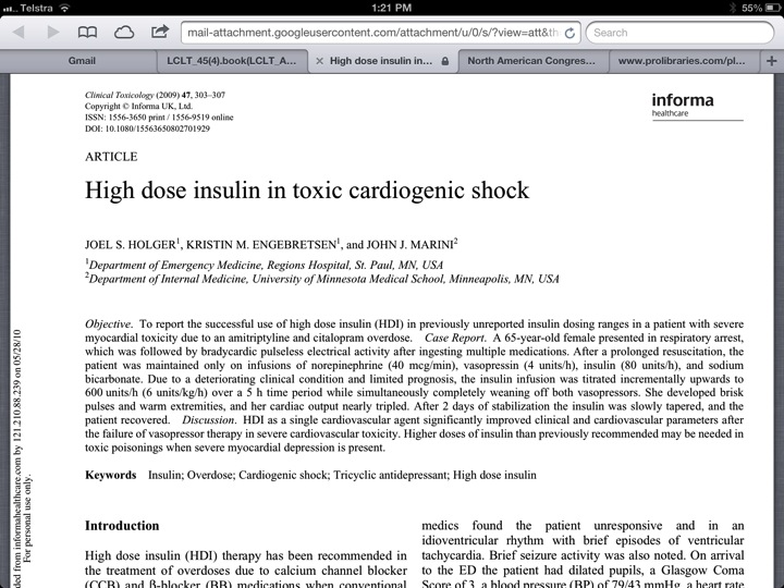 Holger JS et al. High dose insulin in toxic cardiogenic shock. Clin Toxicol (Phila) 2009 Apr;47 (4): 303-7: http://www.ncbi.nlm.nih.gov/pubmed/19514876