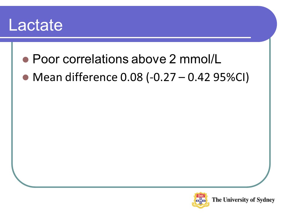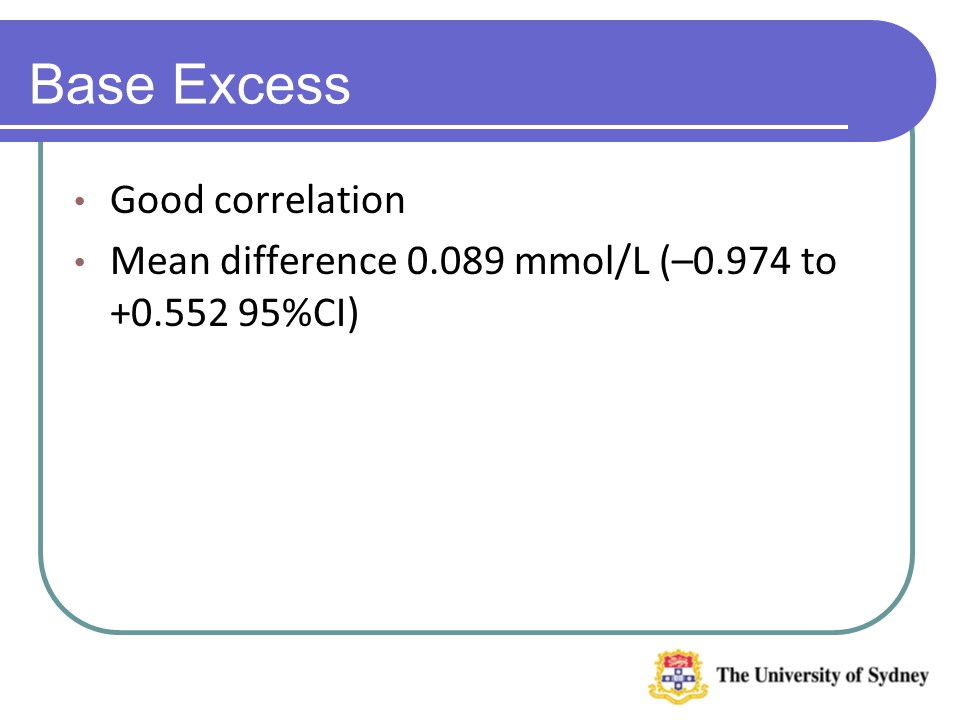 - Regarding base excess, the mean arterio-venous difference is 0.089 mmol/L (n= 103).