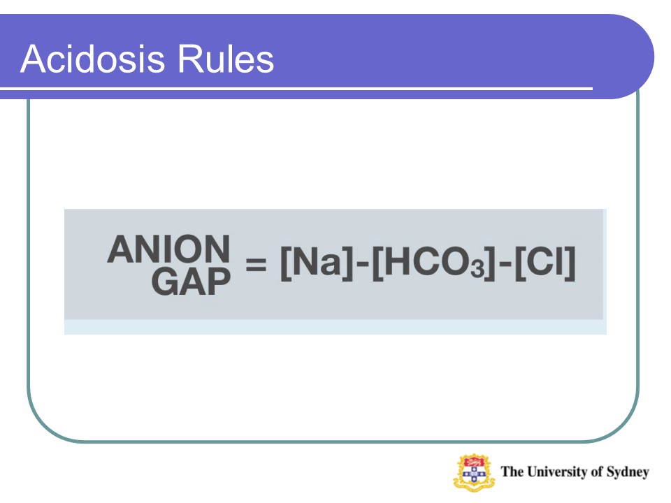 - The ‘strong’ ions in the Body are Sodium (Na+) and Chloride (Cl-) and the Normal ‘gap’ between these should be about 38mmol/L. (e.g. Na 140 – Cl 102 = 38)