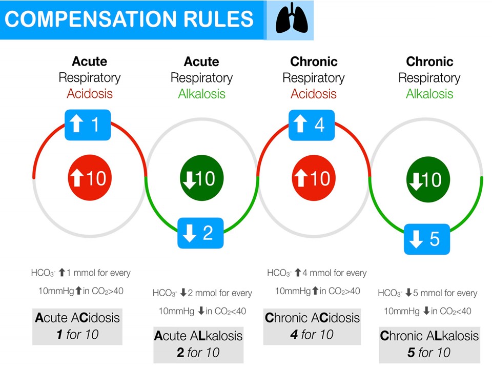 - For High CO2 – Acute – Add 1 to the Bicarbonate for Every 10 rise in CO2 above 40mmHg