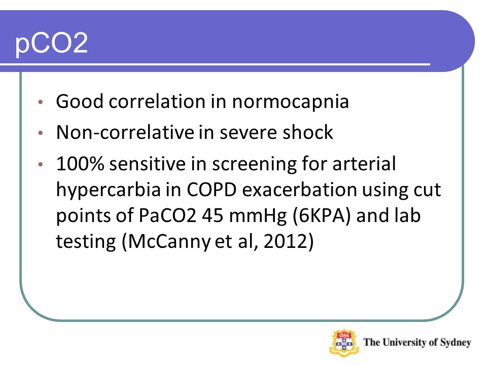 - The weighted mean arterio-venous difference for pCO(2) was 5.7 mmHg (n= 760), but with 95% limits of agreement up to the order of ±20 mmHg.