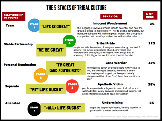 According to the book Tribal Leadership by Dave Logan there are various levels of teams – some are more effective that others. Tribal Leadership states that there are ‘5 Levels’ of functioning team. At the bottom of the effectiveness ladder are teams that undermine each other. At a higher level are the tribal teams we see commonly see in healthcare. The tribal team can be quite effective, succeeding through bonding and competition: