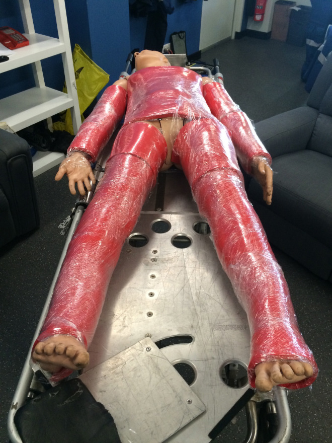 1. Cut the yoga mat into sections and wrap circumferentially around the torso and limbs of your mannequin. Wrap cling film firmly over the top to secure it in place. This red/pink layer represents the viable tissue beneath the eschar — i.e. the end-point of the escharotomy procedure.