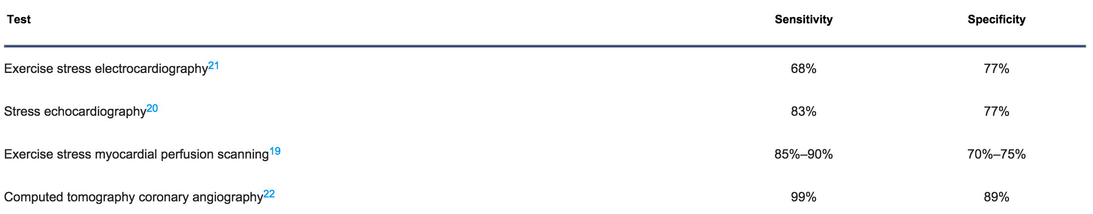 - He quotes the sensitivity of as Exercise Stress Test (EST) as being much lower that the 70-80% traditionally quoted (by many including me) – around 50% or as he candidly puts it – equivalent to a “coin toss”: