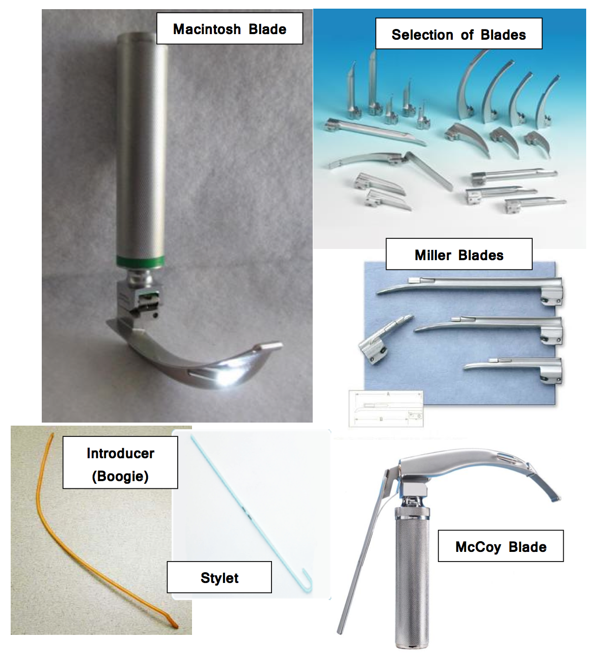 The commonly used laryngoscope ‘blades’ include the MACINTOSH, MCCOY and MILLER types: