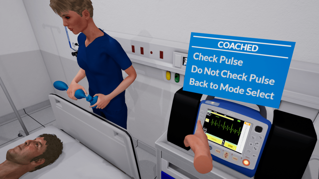 The VR application is built for the untethered Oculus Quest 2 headset – this allows a clinician to take the headset home and practice managing a patient in a cardiac arrest in the location and time of their choosing.