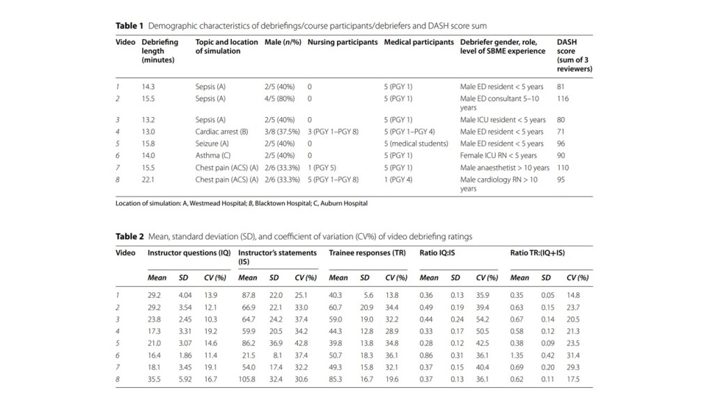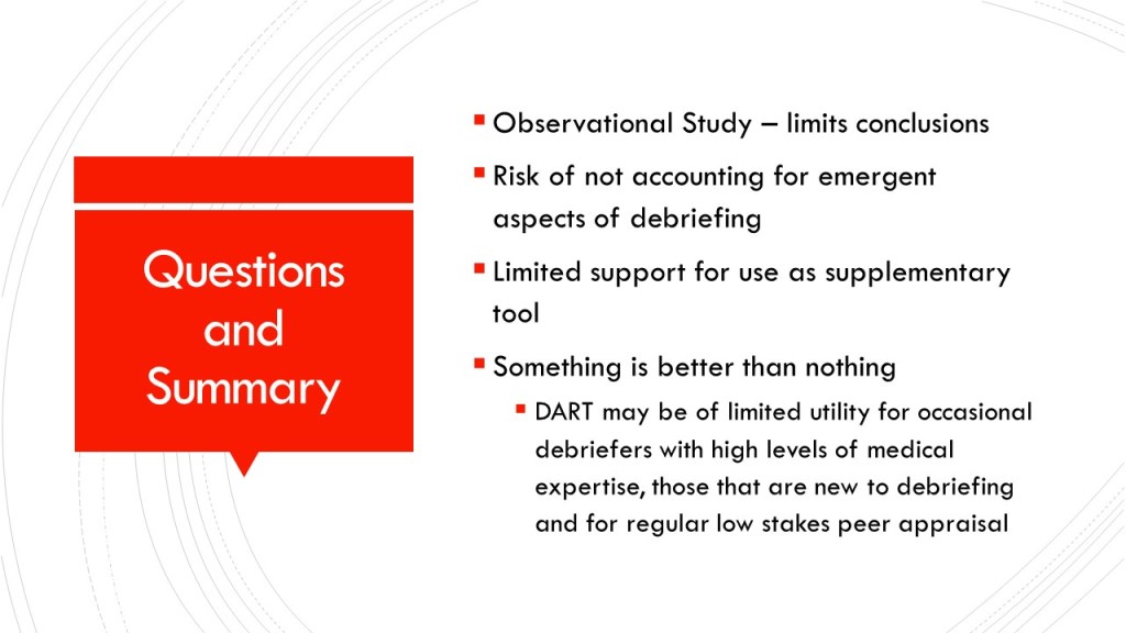 - Baliga K, Coggins A, Warburton S, Mathias D, Yamada NK, Fuerch JH, Halamek LP. Pilot study of the DART tool – an objective healthcare simulation debriefing assessment instrument. BMC Med Educ. 2022 Aug 22;22(1):636.