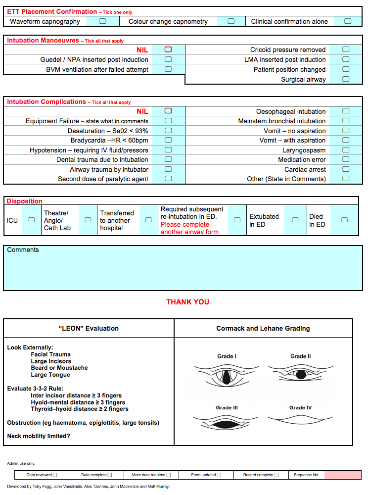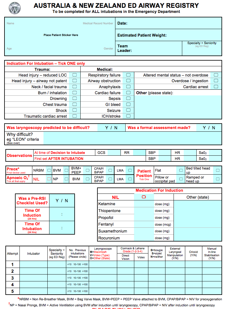 Audit is an essential part of a better understanding of airway pitfalls and improving quality through maximising the chance of first pass success. Here is the Airway Management Audit form for New South Wales: